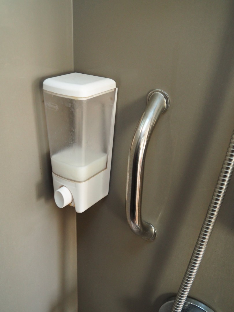 This idea, recommended by the Chinese safety expert "Ah Sup", gives one something to hold onto, other than the lightly attached fixtures supplied as standard. The grab handle available at any boating store, is fastened through the wall, held in place by a couple of large dia. washers and nyloc nuts.