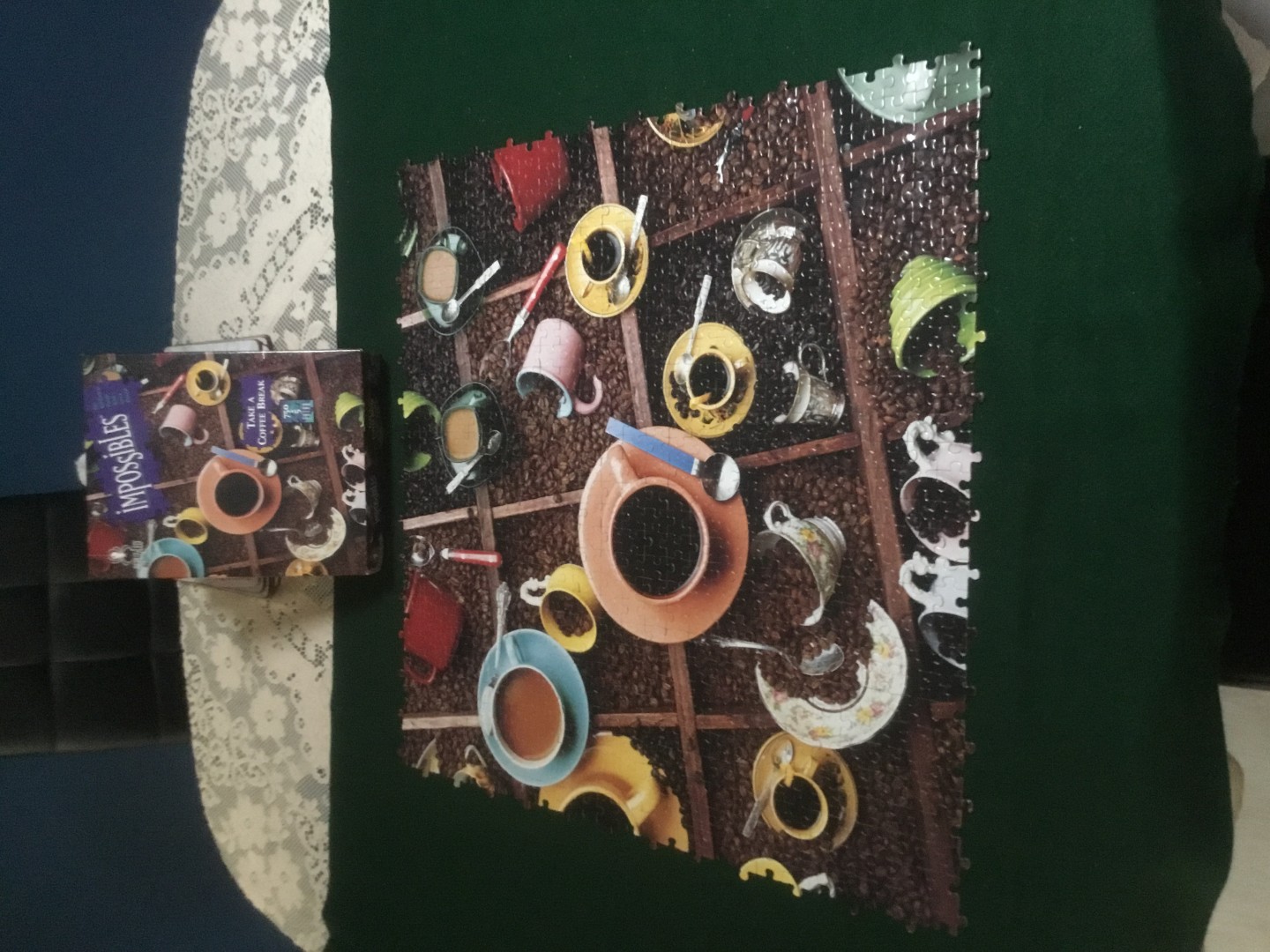 We re entry completed an interesting jigsaw. Only 750 pieces, no edge pieces and 5 extra pieces. This was almost enough to drive us crazy, but a sense of achievement when done.