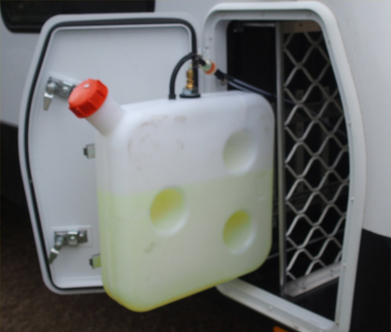 One of them unfortunately added something/fitting on the tank screw cap, to eliminate the smell. So he having now blocked the BREATHER hole for the tank, the tank then Collapsed/sucked in and split, seeping in under the compartment wall into the front of the van.