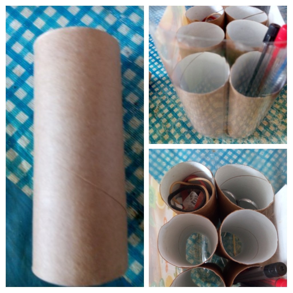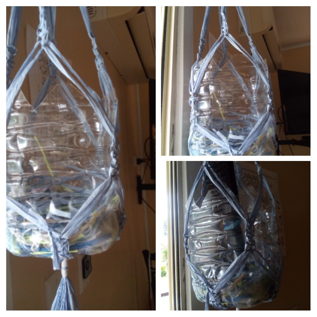 Recycling plastic containers,drink & milk & toilet rolls to make 2 light weight holders of -" bits-".. Macrame hanger of raffia $1-50, from Prices Plus,should not get wet.For outside other strings,ropes are from Reject shops & Overflow..