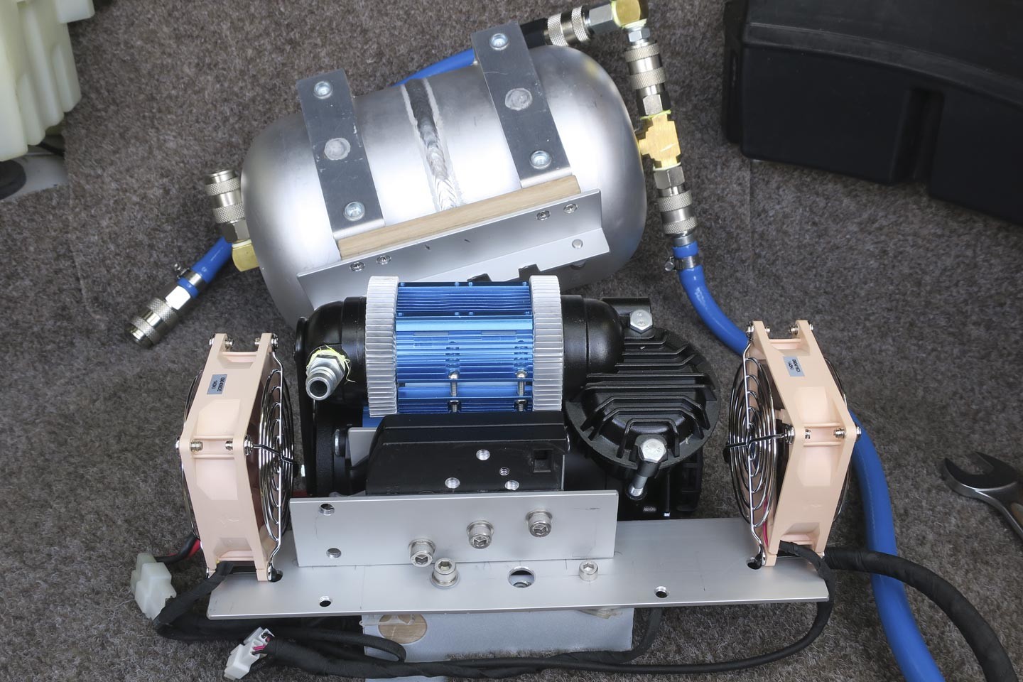 I'm sure a few of you have wondered why I have three compressors. Apart from the issue I could not be bothered stuffing around waiting to re-inflate 4 tyres, I have redundancy. Not only that, the 3 compressors are on a quick release brackets so I can pull each of them out to replace a compressor easily. Also quick release hose connectors everywhere even though I sacrifice a bit of efficiency.