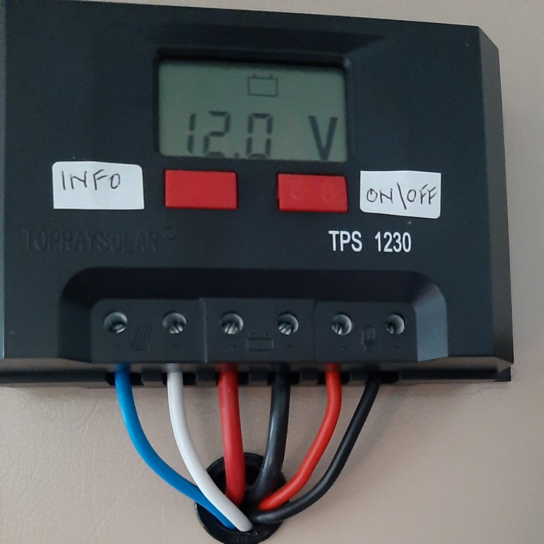 After 15 minutes v was back up to 12.2v (Sun just come out) I pressed the on button on the controller and we had power again.