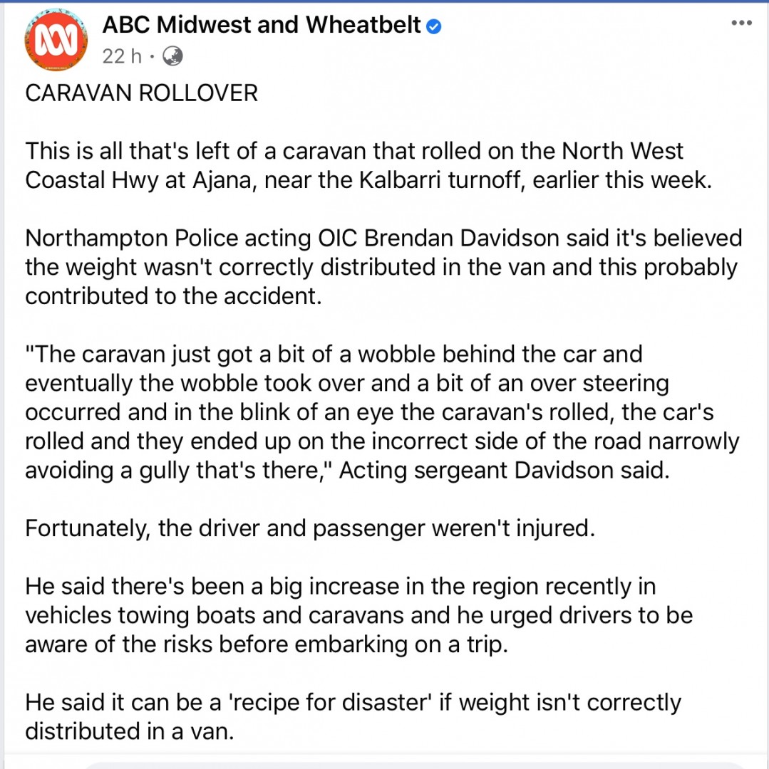 My comment is not related to this accident but an observation whilst travelling between Proserpine and Mackay a couple of days ago. My partner roughly counted 100 Rv's travelling north on the Bruce Why, of them 75% were caravans of all sizes, I would suggest roughly 25% of the newer van were not setup properly, the common problem were neither the caravan and tow vehicle were not level, a few had the the front of the tow vehicle higher than the rear, a majority had the caravan in a nose down attitude, suggesting to me that the ball was mounted too low. Each of these conditions are accidents looking to somewhere to happen and the fault lies directly to the vehicle owners.