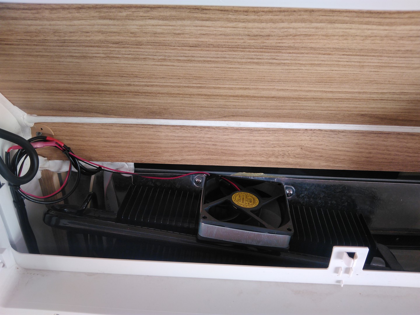I had installed the computer fans, on the upper vent grill of the fridge enclosure.