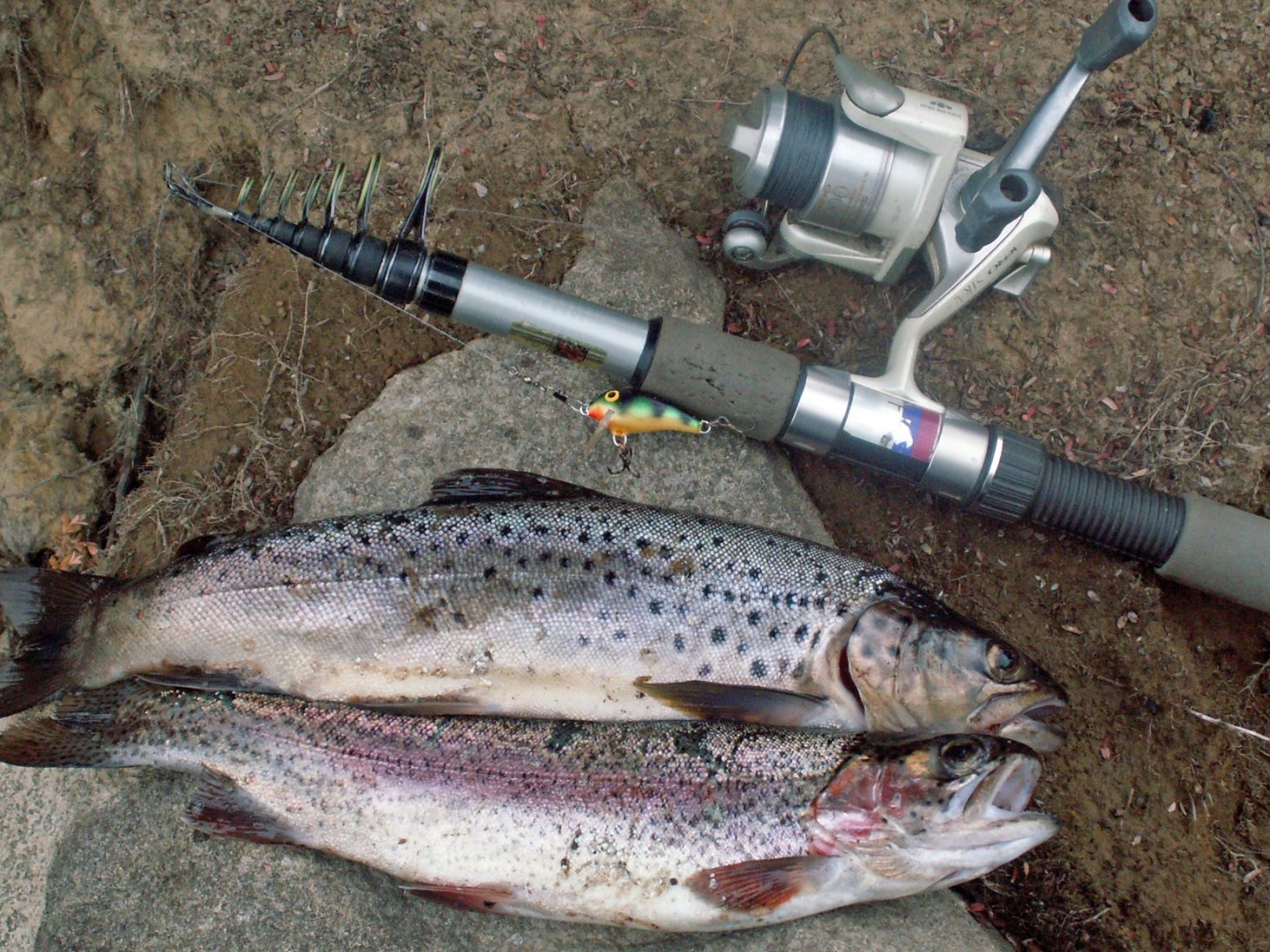 We were driving along this gravel road and went across a creek that went under the road via a couple of big pipes. As we crossed I noticed a trout just past the pipe outlet, so stopped the OKA, found some nylon and a hook, walked back to the up stream end of the pipe, found a worm and a piece of stick for a float, then floated the worm through the pipe and caught the trout :)