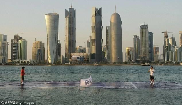 Two of the biggest tennis stars, Federer and Nadal, playing on a water court.