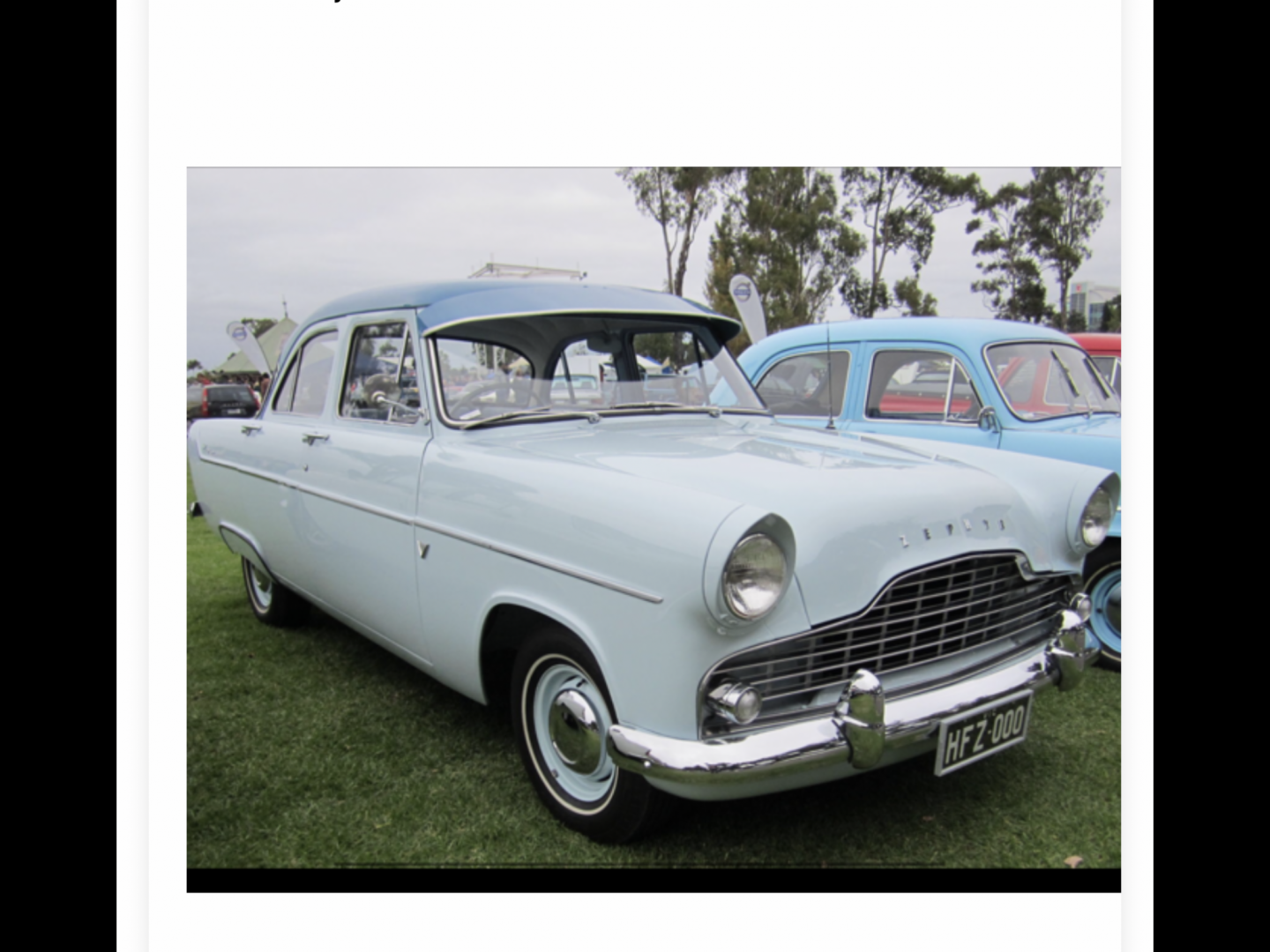 Around 64-66 would be right,I reckon,and the Zephyr is a Mark II.Looks like the first of them,late 56 or early 57,as it seems to have the high roof. Many people do not know that early MKlls first came out with a roof that was 2" higher than the roof on later models,and it was designed to cater for the hats that were commonly worn by the men of that era.Most had external sunvisors,but I'm not sure if they were provided standard,or as a factory option.This model had the chequer-board grill,as in the attached photo,and a domed speedometer,with a sweeping needle. The later model had a bar-type grill,and a 'strip' speedometer that moved across its screen,from left to right.All had bench seats,as far as I recall,and the preferred gearbox was "3 on the tree",although later models had an automatic transmission as an option,I think? People were very suspicious of automatics in the early 60s, with the FB being the first Holden that I recall having one. Cheers