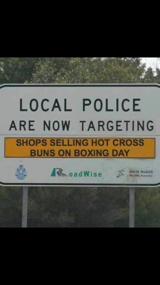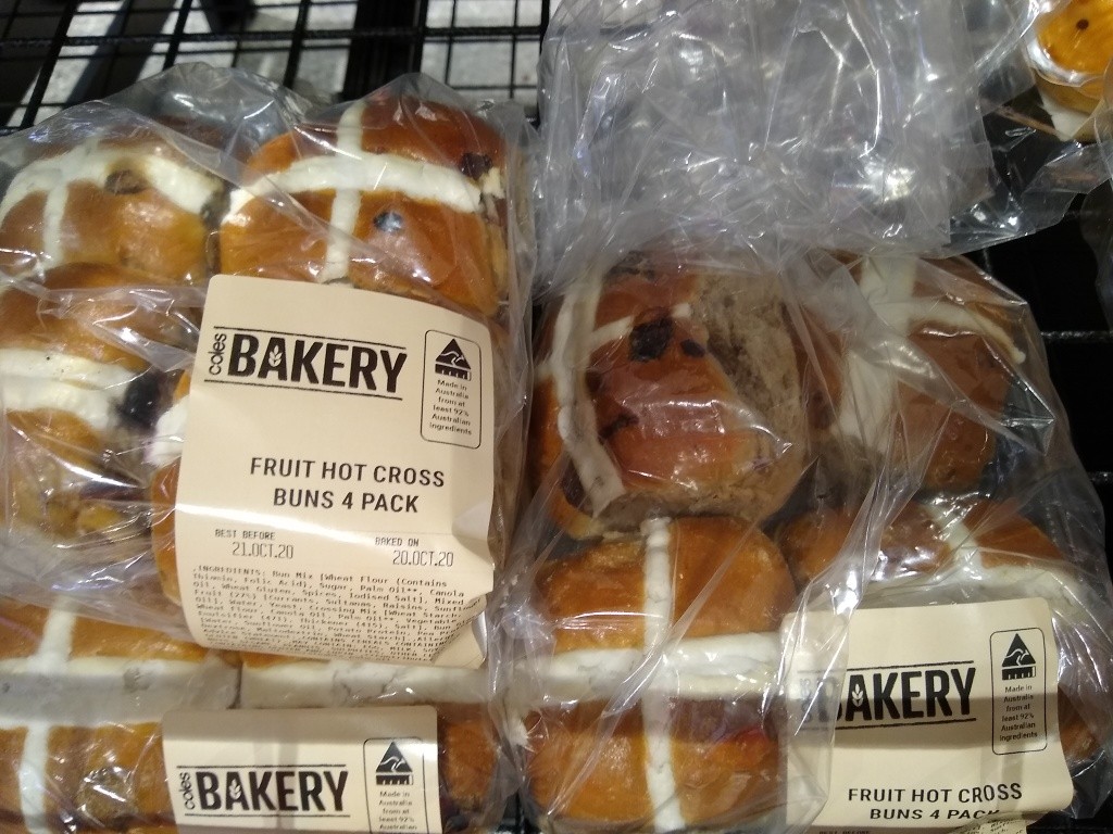 Hot Cross buns on sale a Coles today. No chocolate ones yet. If you like 'em hot from the oven, bakery people will bag them in paper so they don't sweat on the way home.