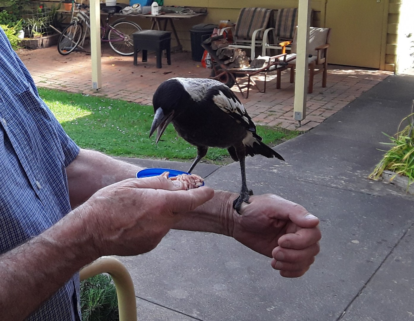 Covid Good News Story.......if we had not been home this year this little fella (Eric..) would have died ,.We found him as a baby , on deaths doorstep, and nursed him back to health. Now he lives outdoors foraging but comes in for a nibble out of my hand morning and night. Great mates and great to see him healthy and being able to use his instincts survive in the wild .