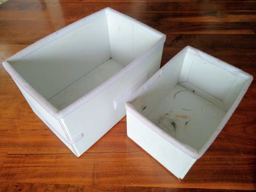 We folded up some coreflute & used double sided tape. The boxes had to fit an exact size in our car. The plastic des rub & edges do cut so stuck the loop half of Velcro on key areas & for feet.