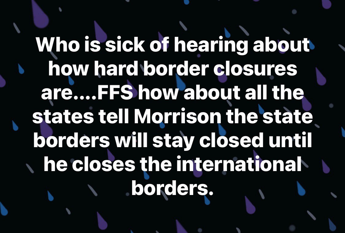 Tell the folks in the vast majority of Qld and NSW, that have never had a case of covid, why they are subject to restrictions. Why folks in Mt Isa can't drive to Broken Hill. Why folks in Broken Hill can't drive to Horsham in Vic. Or Folks in Birdsville can't drive to Mt Isa or the Gold Coast.