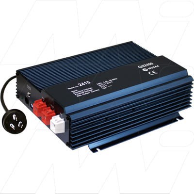 EPS 12Volt 25Amp Dual Output Switch Mode Battery Charger The EPS 1225 has two outputs to charge batteries, a switch for mute function and a switch field for the selection of the charging voltage and timer function. It also has an optional connection for remote control and temperature sensor as optional accessories. This sophisticated switch mode charger has been specially developed for used with all deep-cycle, sealed lead-acid, calcium lead and automotive/marine batteries including immobilized gel electrolyte batteries. It is light weight, compact and efficiency and it will automatically operate on any AC input voltage between 207 VAC to 253 VAC. It automatically charges, without requiring monitoring, all deep cycle, sealed lead acid, calcium lead, automotive/marine type and gel type batteries with a nominal voltage of 12 volts and up to 110 Ah. Charging begins immediate if the battery has been property connected. The output of the charger is electronically protected against short circuit and extremely deeply discharged batteries. It has two out banks so you can charge two batteries simultaneously. We also have triple output version of industrial battery charger model. Charging characteristics The charging characteristics is generally designed as a modified IUOU characteristicn I Phase At the beginning of the charging process, the empty battery is charged with constant current until the battery voltage reaches 13.8 V or 27.6 V. When the battery reaches this voltage level, the charging current slowly drops. With the drop of the current to the 80 % mark, the charger switches over to the higher charging voltage 14.3 V/14.7V or 28.6V/29.4V. UO Phase Here the time registration starts which limits the main charging phase (UO phase) to a maximum of 4/8 hours. With the switching over of the charging voltage, the current rises to its maximum value. Now it remains constant as long as the battery voltage is below 14.3V/14.7V or 28.6V/29.4V. After reaching the maximum voltage, the current drops again. Thereby the voltage remains constant(UO). Within this main charging phase, which is limited to 4/8 hours, the battery is fully charged. U Phase If the current decreases to 10 % of the rated or if the time limit of 4/8 hours is exceeded, then the charger switch over to economy charging 13.8V or 27.6V Twin battery charger Fitted with boost phase time out timer to avoid excessive battery gassing Overheating and short circuit protection Fan ventilation LED charging display Switch for mute function Switch field for the selection of the charging voltage and timer function For motor homes, on sailing yachts, ambulance and emergency vehicles Electrical Characteristics Input 207 - 260 VAC Frequency 50 - 60 Hz Protection Internal Primary, Inrush limiting Boost charge voltage 14.4V / 14.8V Float charge voltage 13.8 V Output charge current 25 Amps Battery connections two Max battery capacity 300 Ah Topology Switching shutdown Efficiency 90 % Short circuit protection Output shutdown Over current protection Secondary current limited Reverse polarity protection Internal fuse Fuse T4A / 250 V UO phase limitation 4 hour or 8 hour Mechanical Characteristics Case dimensions 310 L x 240 W x 77 H mm Casing materials Extruded anodized aluminium Weight 3.5 kg Cooling Fan cooled Environmental Operating temperature range -5 °C to 50 °C Storage temperature - 30 °C to +85 °C Relative humidity 10 % to 90 % non condensing Altitude 0 - 3000 m Quality and Safety Designed to IEC 950 EMI-EMC - FCC Class B, CE,C-Tick Standard AS 3193 Input connection - 3 core SAA cable IEC