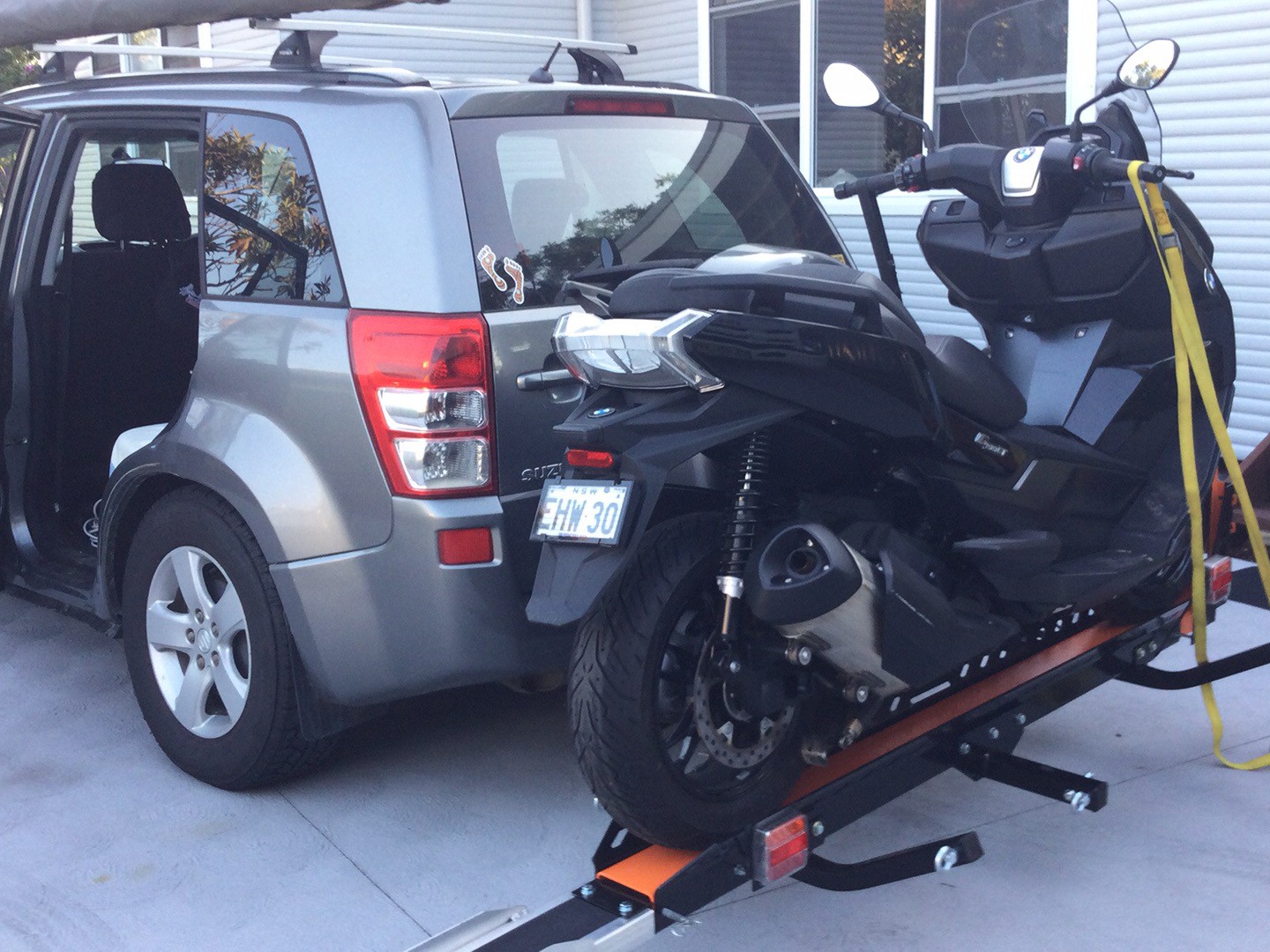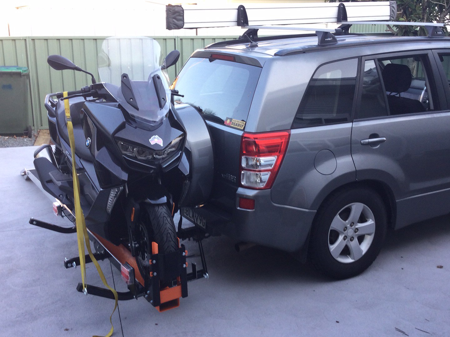 it is not intended for the Suzuki but the thought did cross my mind in towing the Suzuki with the scooter on the back but the Suzuki was doing wheel stand