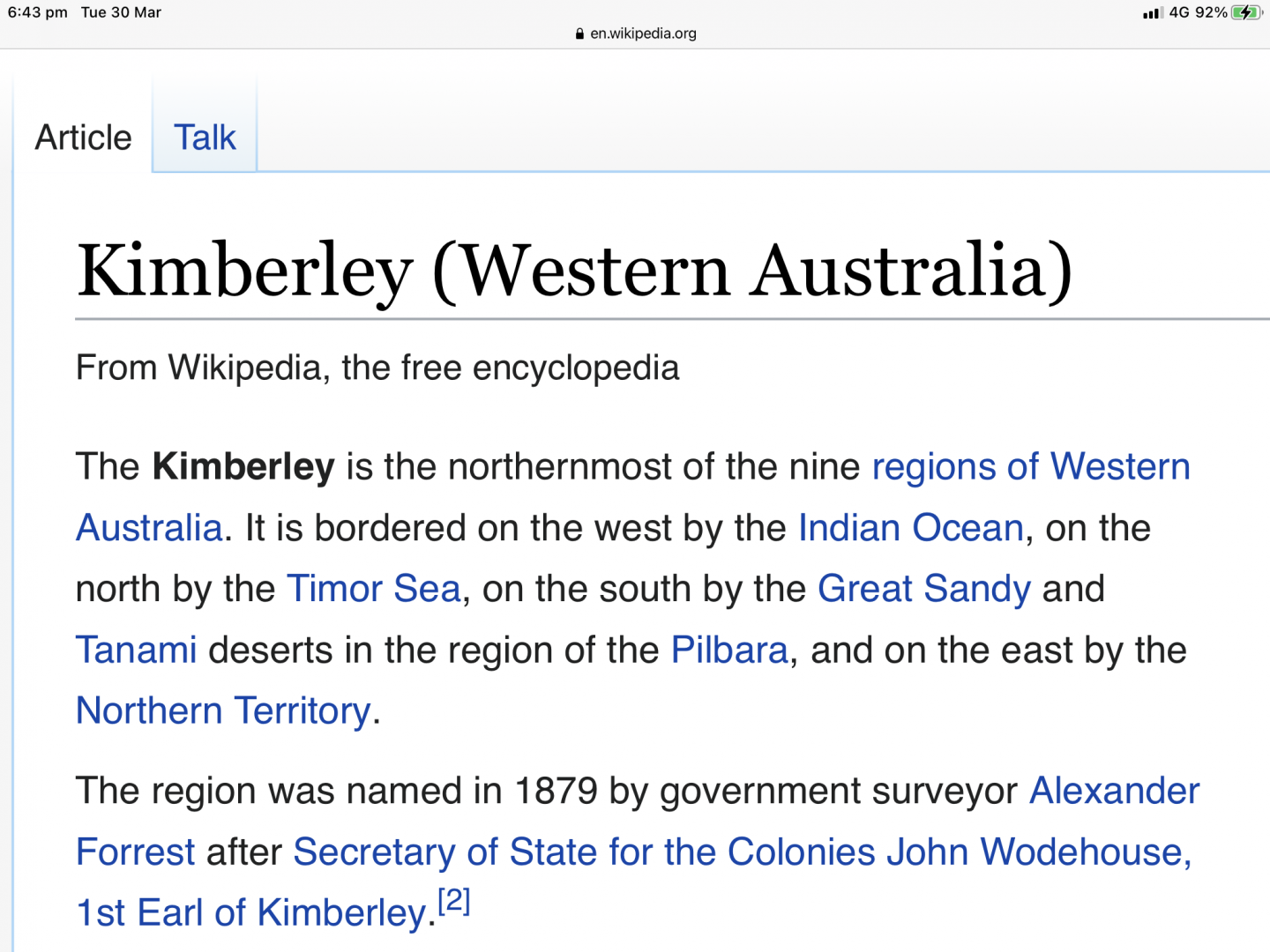 For some trivia it was named after The Right Honourable John Wodenhouse, 1st Earl of Kimberley, but it is curiously similar to the Kimberley region of South Africa where they also mined diamonds.
