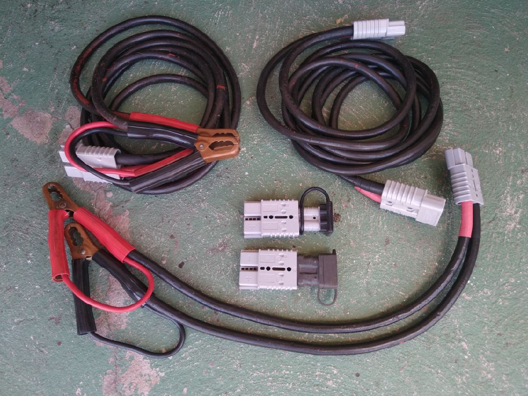 Short & longer jumper leads (ends which can be use conventionally) & Anderson extension lead. The extension I can use to self jump start, or with 175 to 50amp adaptors use for a desperate extension on the solar panels. The clamps are Utilux 200amp continuous 2mm thick solid copper.