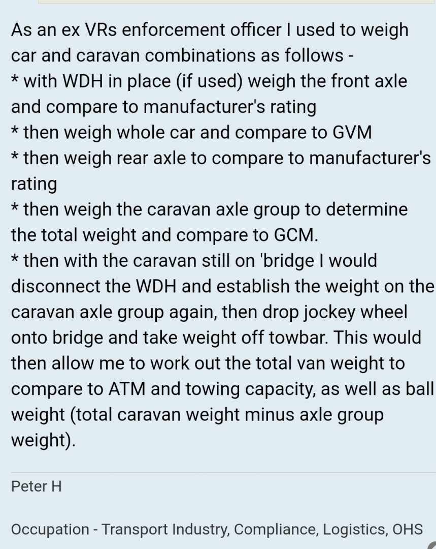 Hi Ian.Not quite sure why you'd be "Not really interested in ball weight",as that is one of the most important figures,along with rear axle weight on the car.Anyway,if you go to the weighbridge,with the van in tow,weigh front axle of car,move forward and weigh whole car.Check you're not over your GVM rating.Subtract front axle weight from total weight to get rear axle weight. Check that against axle carrying capacity.Drive forward until both car and van are on bridge,and note the total weight.From total weight subtract weight of car,and you will have your GTM (Gross Trailed Mass,or weight on van wheels).If the weighbridge is too short for car and van together,after you've established the total weight of the car,simply drive the car off the weighbridge,but leave the van's wheels on bridge to get GTM.Add that to car's total weight to get your all-up weight,and compare that with your GCM rating. If you want to check total weight of van does not exceed tge ATM rating,just lower jockey wheel onto bridge with car not on bridge. You then can calculate towball weight,but not very accurately.That's another story though! Good luck! Cheers