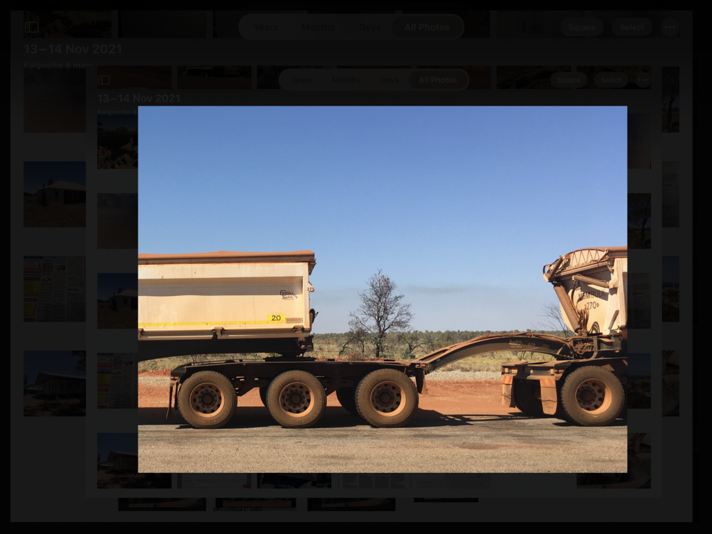 You're right,Possum.They're 60 metres long,have 110 wheels,and weigh 205 ton wheen loaded.The ring feeders are over the middle axle of the dolly,rather than at the rear,making the whole rig more stable,with the trailers tracking perfectly.They're only 615HP,with 18 speedboxes,but sit steadily on 90kmh once they're rolling.Supposed to swap drivers after a 12 hour shift to keep them running 24/7,but if there is a hold-up somewhere, maybe puncture,loader problem,unloading problem (they're side tippers) or something else,the new driver can be waiting 3-4 hours to start his shift! As for overtaking,the usual couple of flashes of the right blinker is used when it is safe to overtake.Cheers