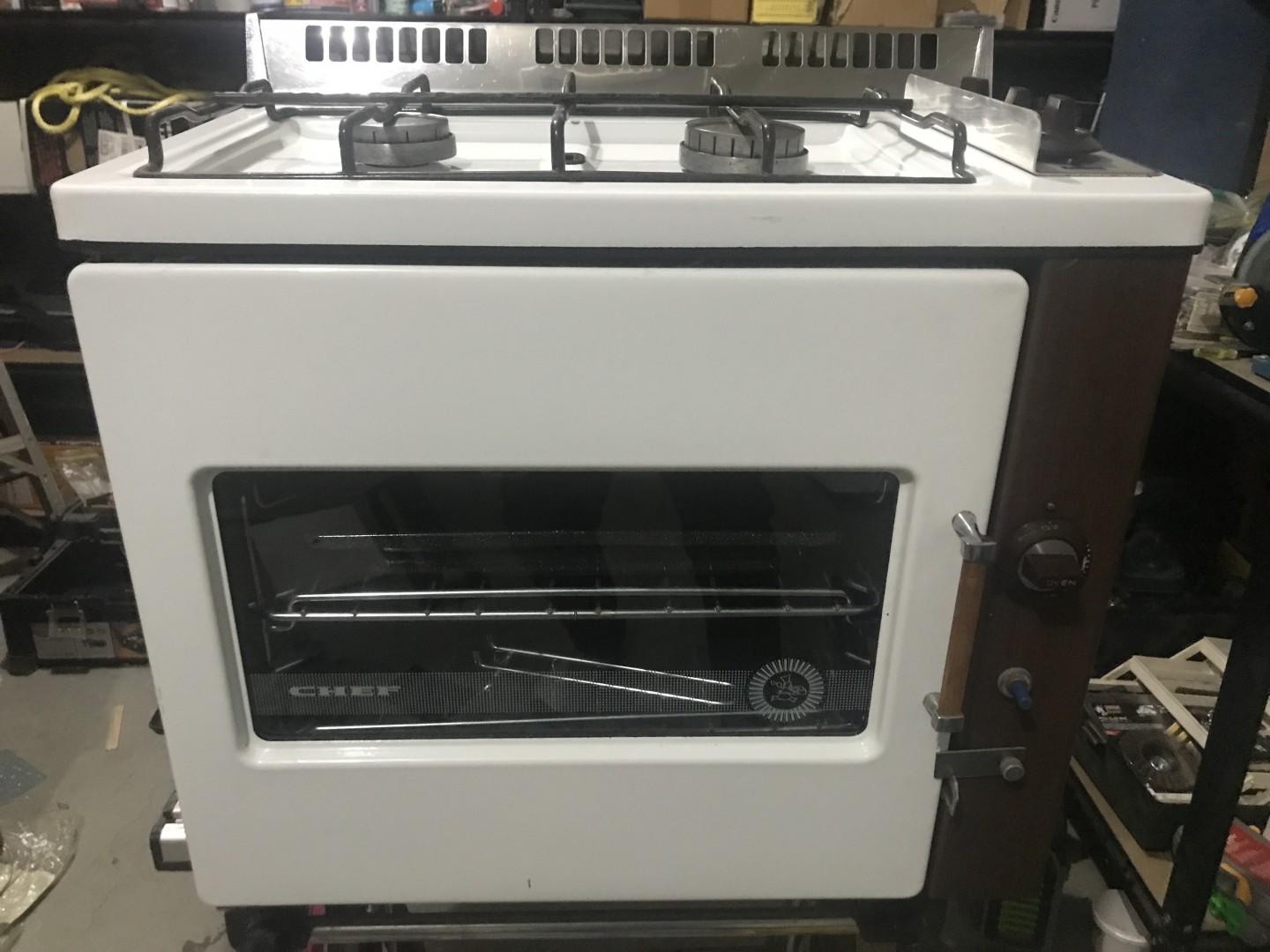 Just an update on the Chef 070A cooker. I removed the cooker and stripped it down completely to give it a good clean. It came up sparkling. Underneath the stove, we found the original instructions for the stove and the fridge. The instructions for adjusting the burner aeration! While it is out of the van, we decided to give it a good test and to see if the burners needed any adjustment. As it turned out, the flames are all burning a soft blue, with no white-tipped flames, so the aeration is perfect and it needs no adjustment. The oven worked a treat and burned for 3 hours, so it's nice and stable, which is a relief. I've read stories about the flames going out on these, but I think those are just poorly adjusted or the jets need cleaning. These things are really so simple and maintenance will be minimal. We'll give it a proper test tonight and cook a meatloaf. It's definitely a keeper and much too good to toss out!