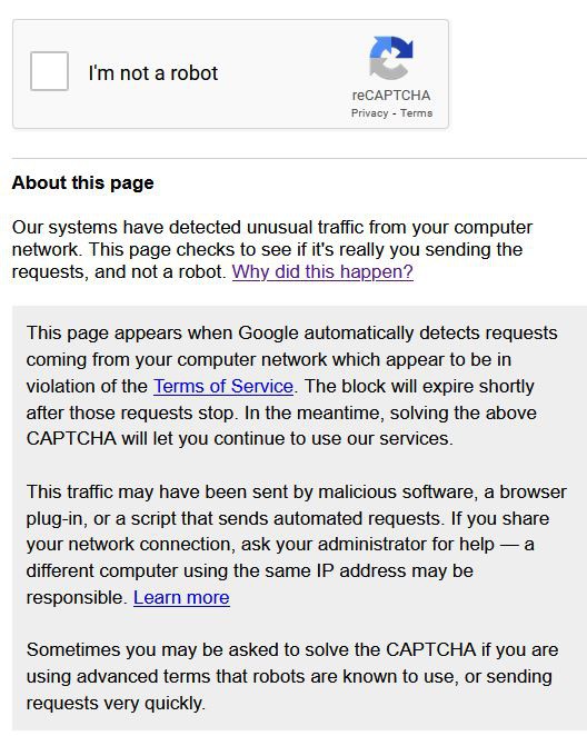 One of the things Google *really* wants to stop is people trying to confuse it; Google tracks what you do and tries to build a profile of you. There is software available which tries to defeat this, this software may be run in the background on your machine and will perform *lots* of Google searches for random items. One search may be for bras, the next for guns, the next for camshaft shims etc. such diversity totally confuses Google and makes you a much less attractive profit source. And they do not like it :)