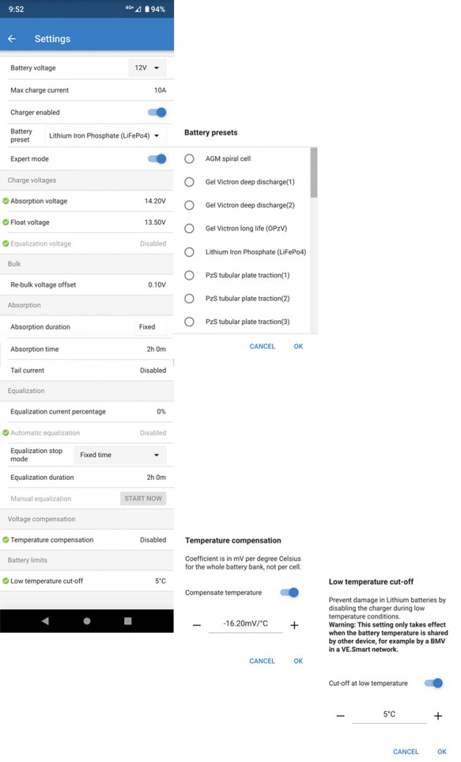 Some settings on my Victron MPPT 75/10 Bluetooth controller.