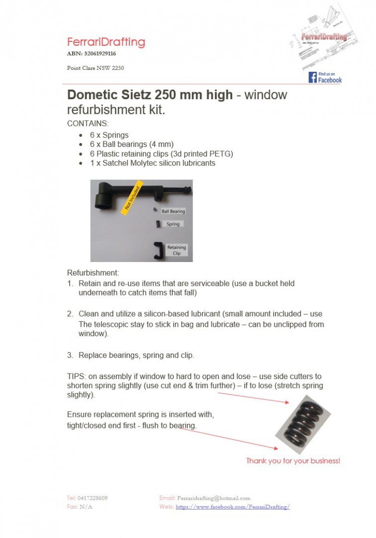 The kit allows for the refurbishment of the above listed plastic window stays that are commonly located on the small jayco caravan bunk and kitchen windows. Overtime these jam up and the internal spring and ball bearings are removed to allow for partial function (complete replacement is normally around $75). This kit allows you to repair a minimum of 3 windows (more if you have kept some of the parts).