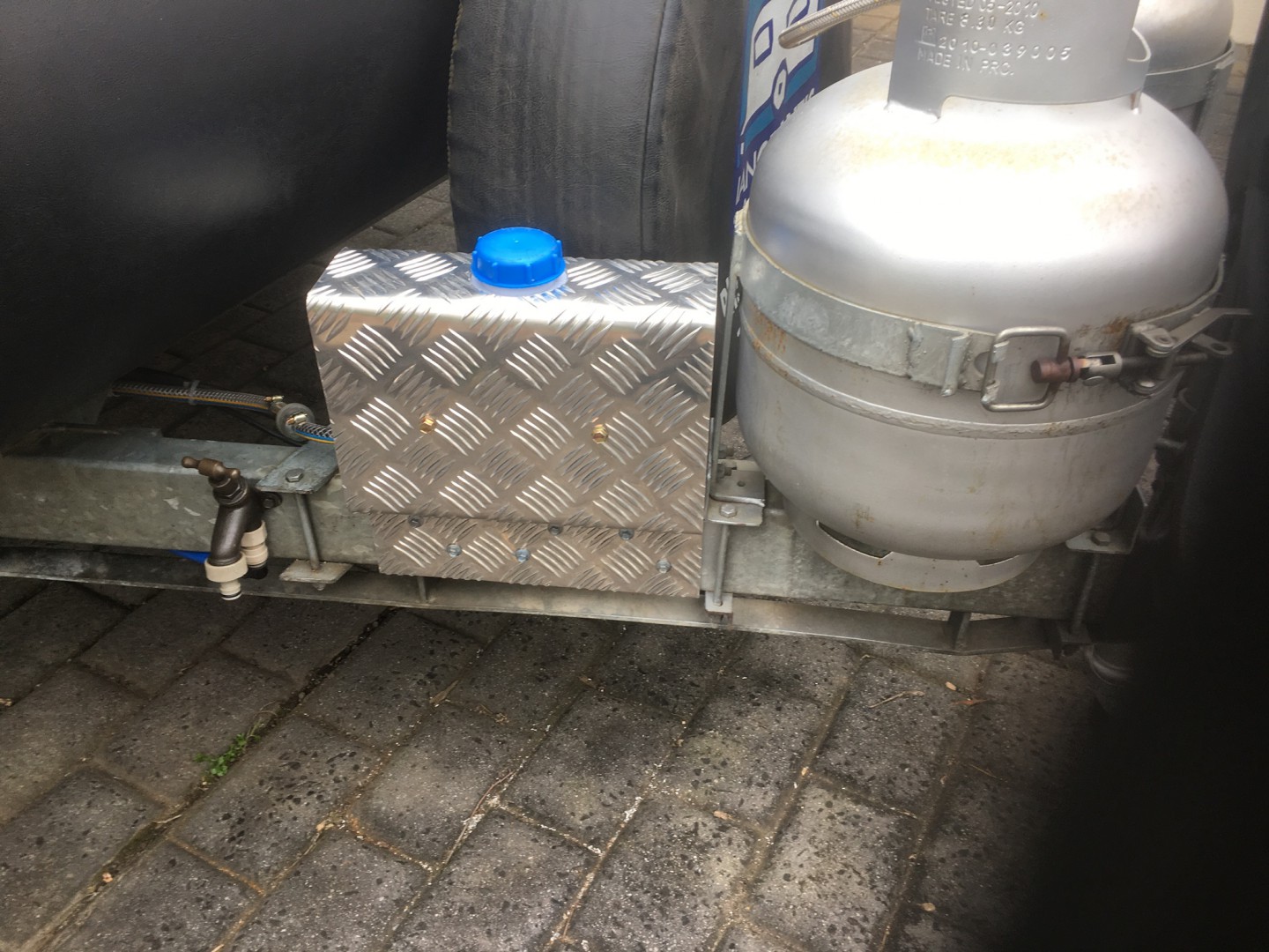 5 Litre Diesel Heater Tank & 2mm Checker Plate mount. Unique design simply fits over 50mm A frame or rear bar, complete with self drilling screws and LHS or RHS fuel connection.