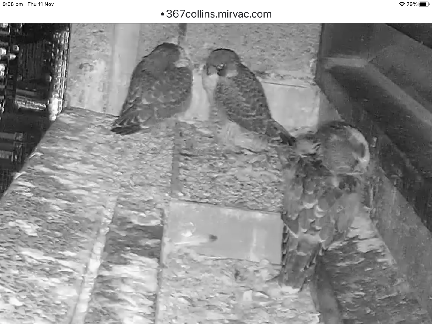 As people will have noticed the remaining nestling (a male) is struggling. I don't know exactly what is going on. From my experience it is most likely a heavy *Trichomoniasis *infection. This is not uncommon in urban and industrial settings where introduced prey species make up a higher proportion of the diet. It is now too late to intervene and approach the ledge as this is guaranteed to lead to this nestling jumping off of the ledge to a certain gravity induced fate. In fact the disease has probaly already progressed too far. To approach it once it is too weak and malnourished to make that jump will also be too late to actually prevent it succumbing to this disease. I have consulted with people whose experience with this species and disease I respect and they have reconfirmed the merits of this approach which has been adopted at 367 Collins Street for some years now. As it becomes increasingly obvious that the disease is progressing I will be recommending Mirvac to then switch off the live feed. Little will be gained by watching its last hours or days.