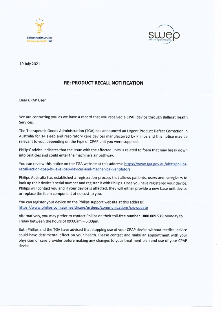 Ausie Paul. I have one of the affected machines which I purchased privately from a Ballarat retailer. At this stage ( unlike the US ) there is not a full recall from Philips, but Philips have asked that all affected customers register their interest so that they can contact them after they decide whether they are going to replace or repair the affected units.