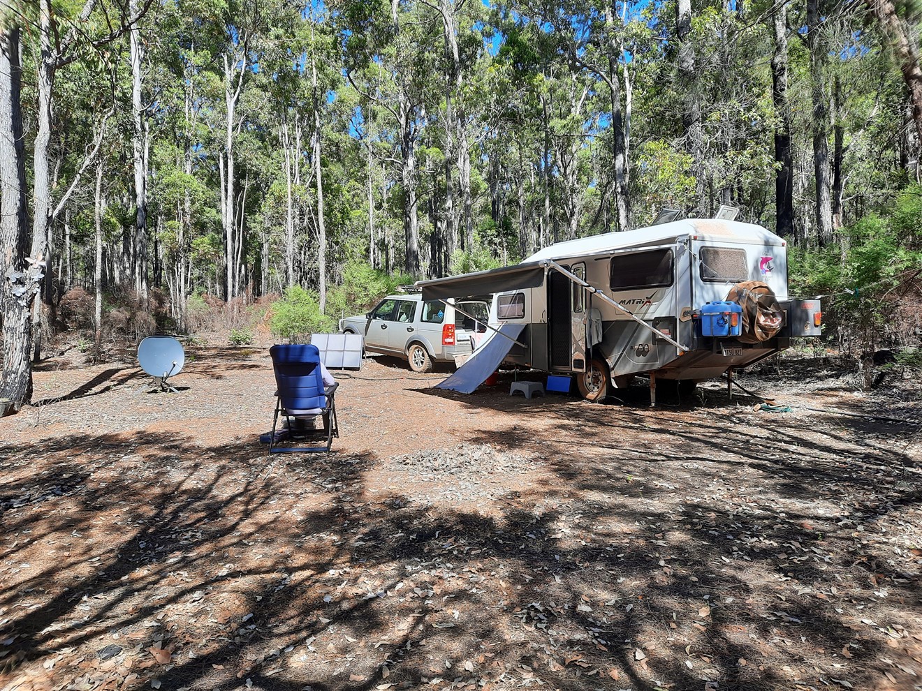 Well, we tried out the new stand last month at our secluded camp spot and I am quite happy with it, peak input we had was just over 20 amps with both systems inputting,we filled the 200AH lithium by 11 each day and considering we were in State Forest and full sun between 10.30 and 1pm we were happy with the results. As said previously I only want a system that does what I need and it does it well. A pic of the setup.