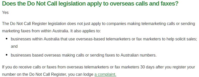 Not true. International companies that want to do business in Australia have to follow the same set of rules. Scammers tend to not follow the rules but real telemarketers do. Maybe the calls you are getting really are scammers, not telemarketers. From the FAQ on that website ....