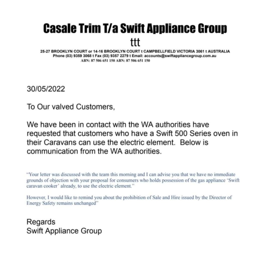 Swift Appliance Group Pty Ltd is currently liaising with the ACCC, WA DMIRS and Resources Safety and Health Queensland regarding gas explosion safety risks in the 500Series Caravan Gas Cookers. We will provide more information as soon as possible after conferring with the regulatory bodies. Consumers must immediately cease using the products until tests determine the cause of the explosion and the products are deemed safe.