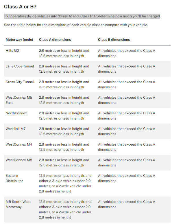 That is almost correct. NSW Tolls are charged on the length AND HEIGHT of the vehicle and it is the height that typically catches motorhome owners as we are often over 2.8m. Why there is a height restriction is beyond me. I would have thought length (space taken up on the road) and weight (long term damage to the road) would be important. Attached are the definitions off the NSW govt web site.