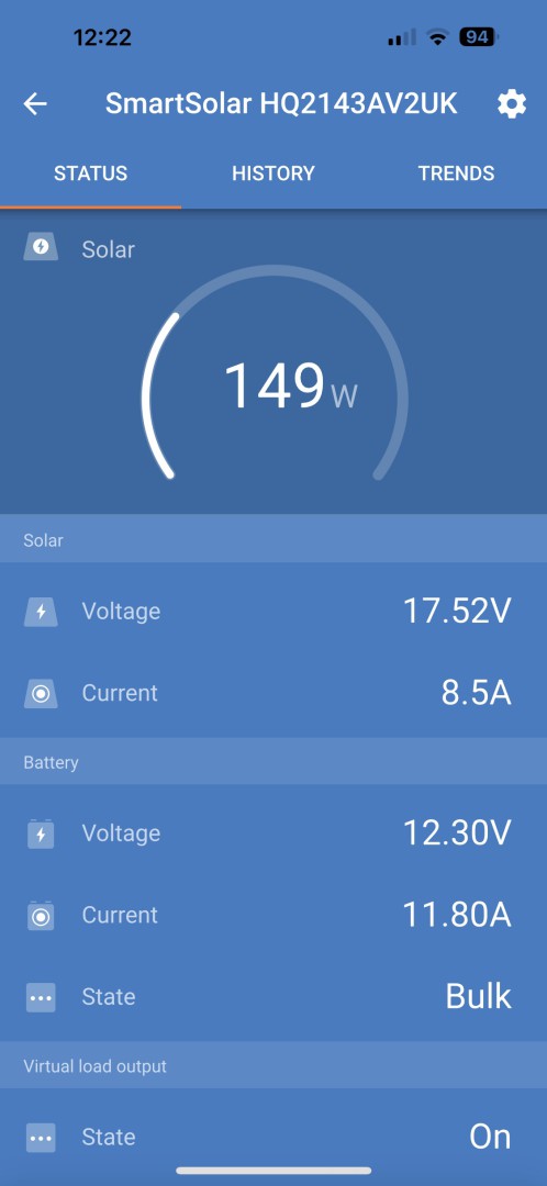 Hmm TimTim interesting to see the MPPT regulator at work there. Panel output 17.52 V @ 8.5 A battery input 12.30 V @ 11.80 A. If it was a PWM regulator it would be giving 12.3 V @ 8.5 A =105 W. Just saying for those not yet converted.
