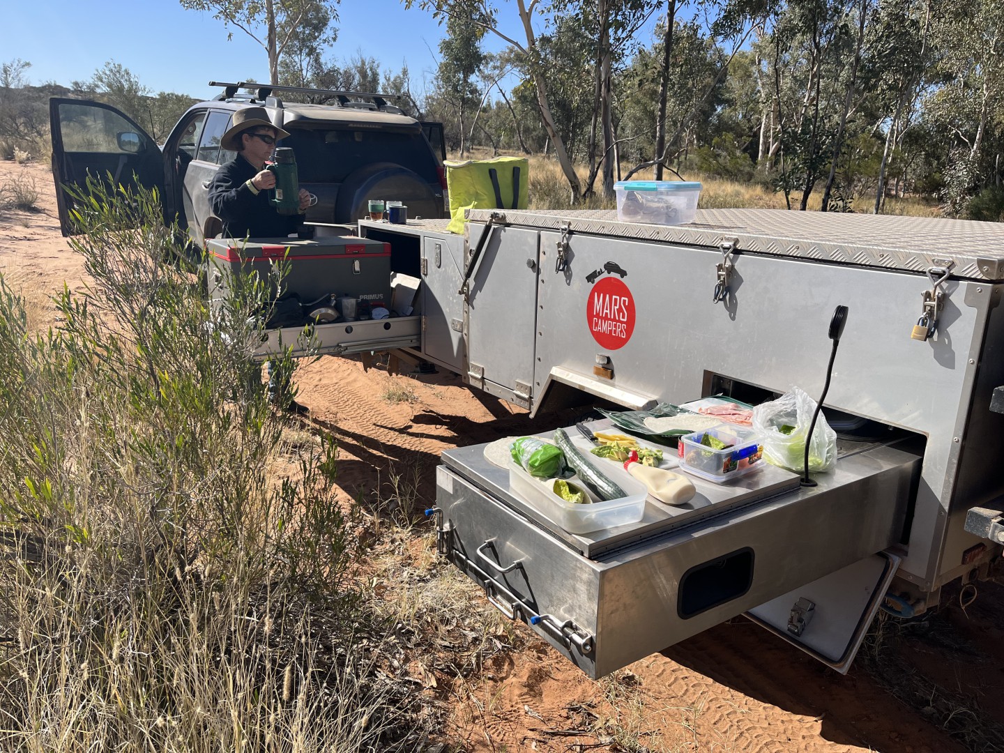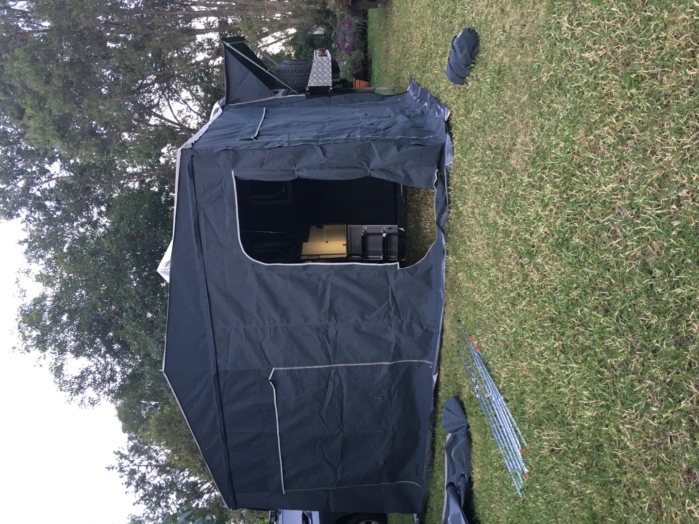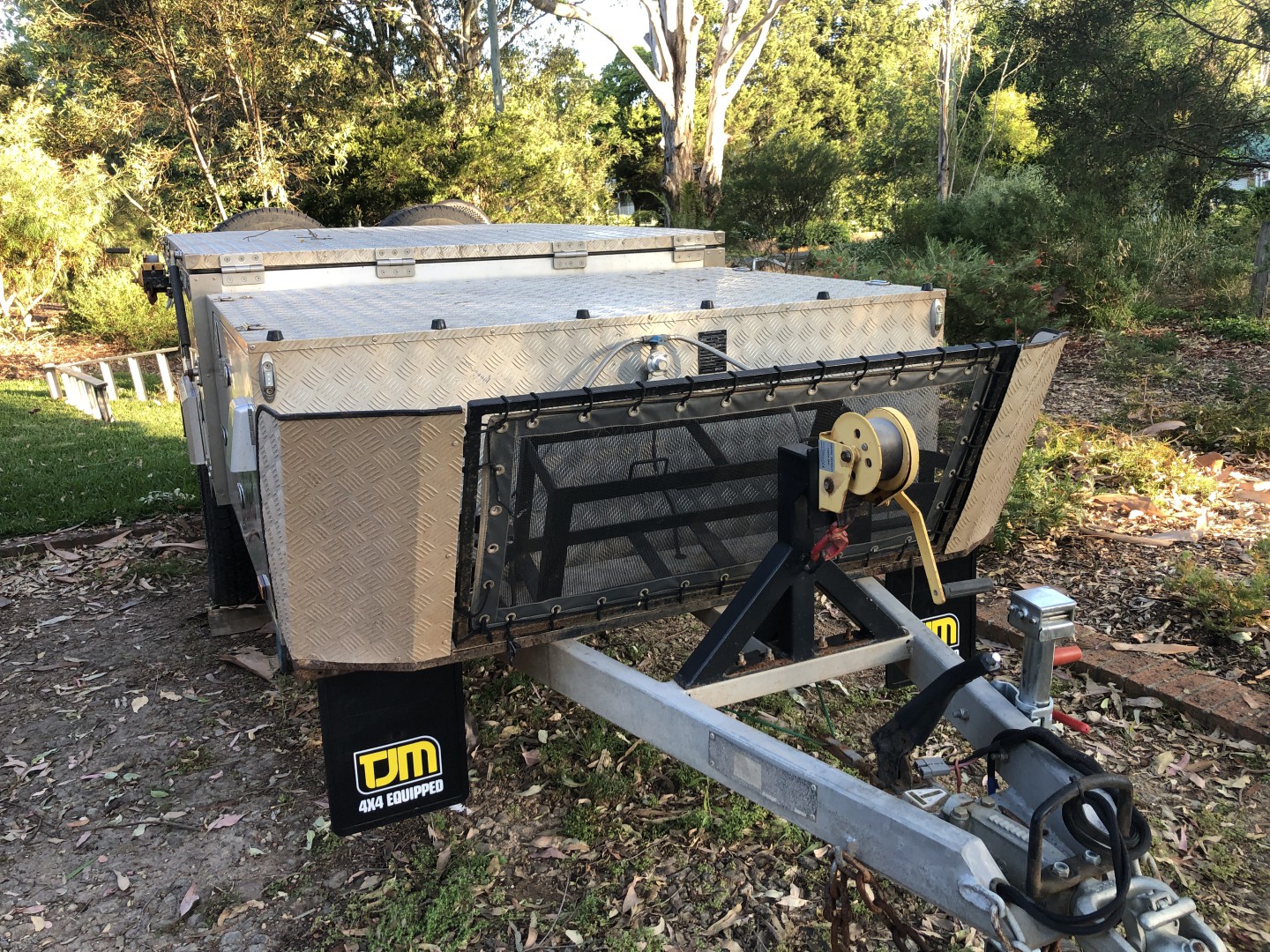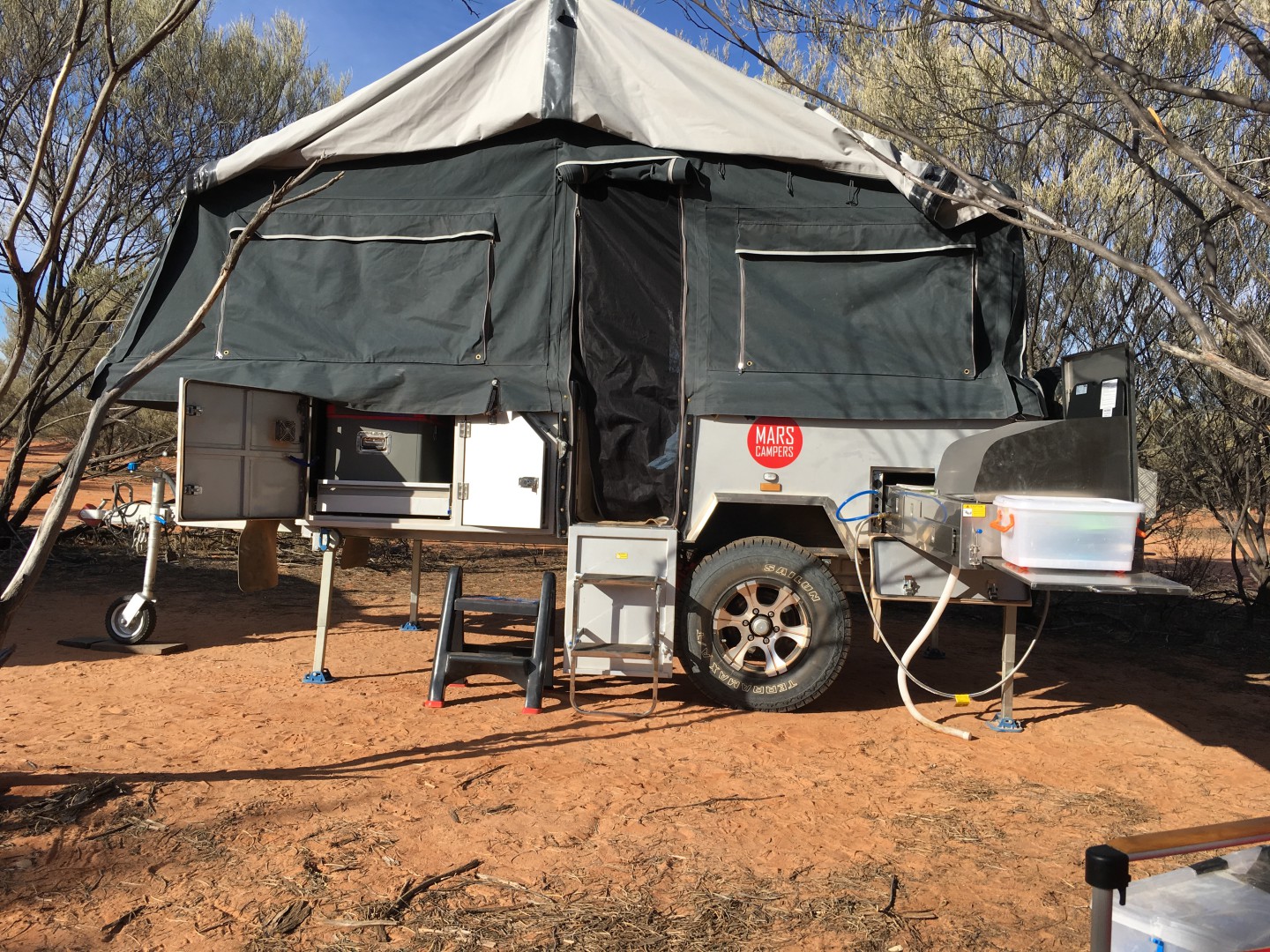 Mars Sprit 2Pac forward folding camper trailer 2017 model. Good condition all over. Standard features include slide out kitchen, fridge slide, queen sized mattress, inside table and seating which converts to a double bed, full all round canvas awning, 2x 9 kg gas bottle holders, 2 x jerry can holders, 2 spare wheels, 120 litre stainless steel water tank, 2 x100 amp hour deep cycle AGM batteries and full off- road suspension. Shock absorbers have recently been upgraded to Pedders ones and new bearings and brakes have been fitted. Non standard additions include a Projecta DC-DC battery charger with solar regulator and input via an Anderson plug, 240 volt charging input via an Anderson plug , Alko 3.5 tonne off- road towing hitch, Alko heavy duty jockey wheel and a rear mounted mesh compartment suitable for carrying firewood. Included are a 12 volt shower with privacy tent, Thunderbox toilet and 1 set of spare wheel bearings.