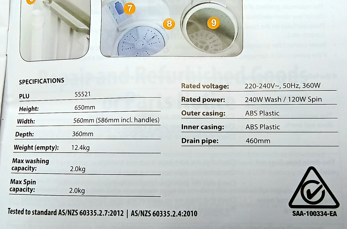 I found it did a great job in 6-7 minutes washing time, and the spin was amazing. So, with 240 watts on wash, and 120 watts on spin, it would take very little battery capacity. Being designed for RV use and having low startup current a small inverter will run it. It weighs 12kg and is still in the box, so easy to move.