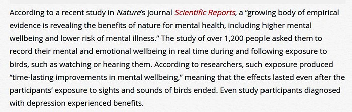 Having taken up bird-watching & photographing as a bit of a hobby, I can only agree with the findings of the research published in 'Nature'. Non bird lovers may well s mirk, but seeing a new, not before seen bird is something I get quite excited about & the opportunity to observe birds to learn something of their behaviours & routines is a privilege, (just as any relationship with any animal is). But more than anything bird watching is just a fantastic reason for getting out into the bush.