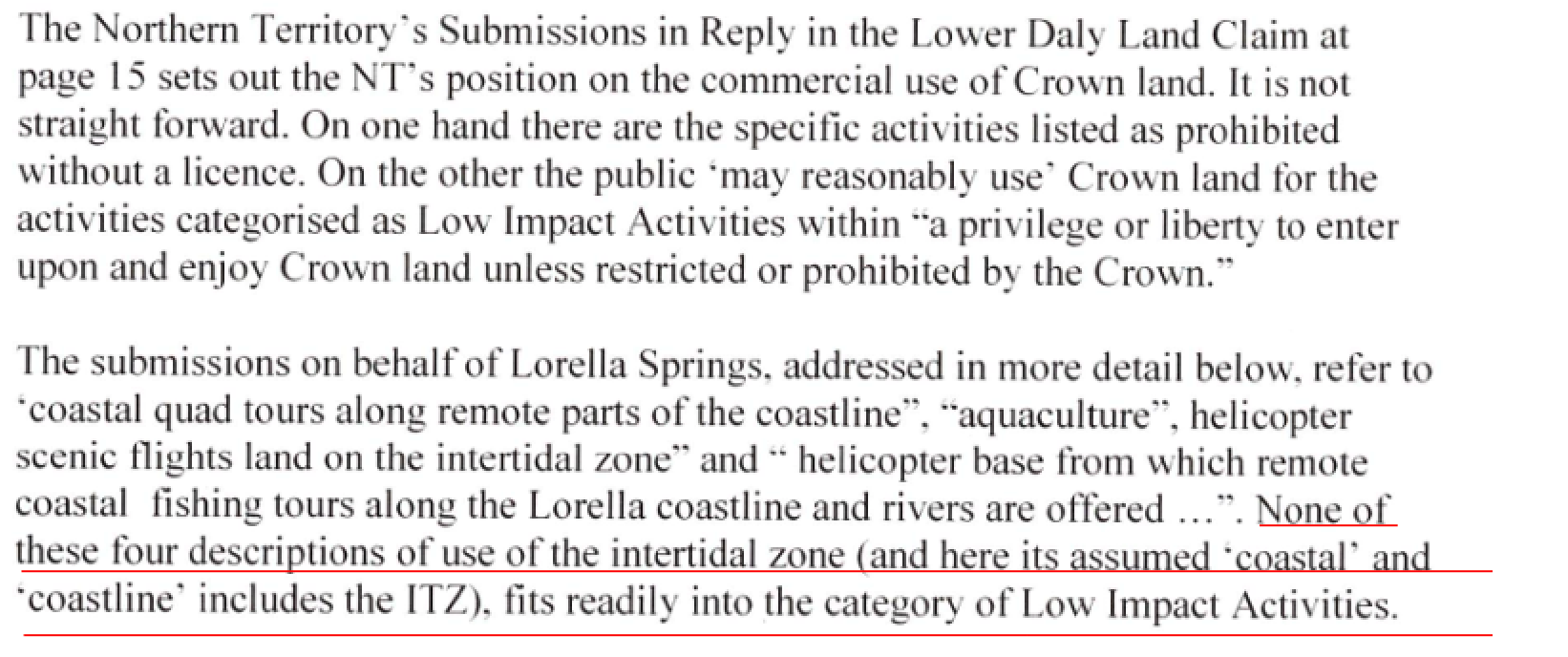 Also it wont be the land Council taking control of anything, it will be local people retaining the rights they have over their local land. If you re-read the documentation you will see that if the land claim is approved, which it seems likely it will be, that Lorella Springs would be allowed to continue use of the areas on the intertidal zone, but would require a licence to do so. The documentation states that the licence would either be cost free or a peppercorn fee. That seems very generous to me.