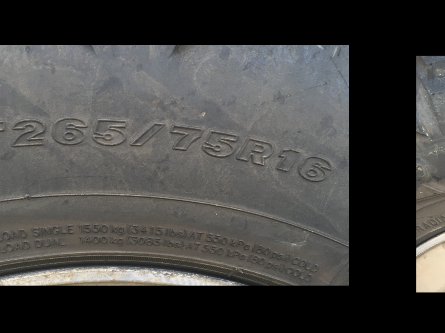 To help this fella, who no doubt will return to read our forum, I have posted a couple of photos from the sidewalls of my tyres, clearly showing that they're rated to carry 1550kg each and maximum pressure is 80psi. Cheers