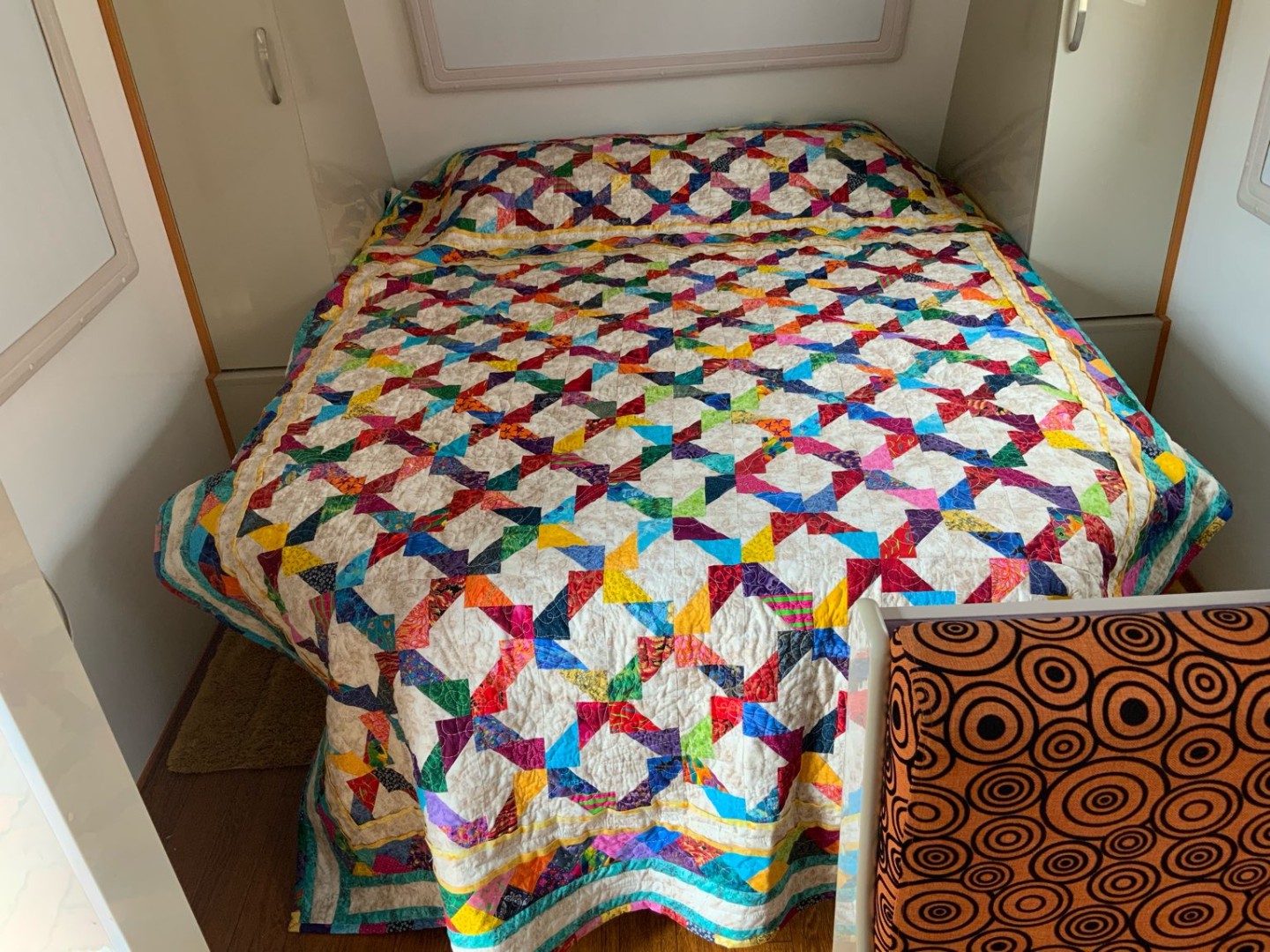 My good wife finished the bed quilt for me, as you can see I prefer bright colours.
