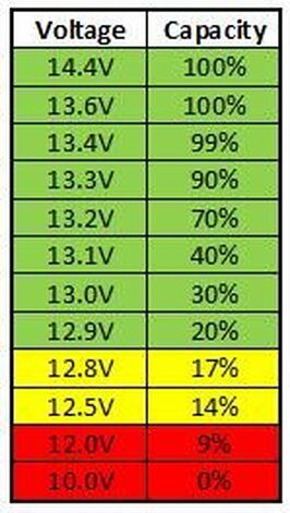 Thanks very much for that table TimTim. In my total ignorance I used to think that as it was a 12 volt battery and the gauge was showing 12 or slightly above, that all was well in the world of batteries.