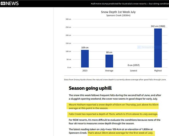 My take on the article is that in April there was a prediction that climate factors COULD lead to a poor season. Current readings are that one place in NSW is well above average, while Victoria is a little above average. My experience has shown that the quality of the season is dependent on rain and temps in April/May to get the ground cold and wet and so hold any snow that falls. That has happened this year.