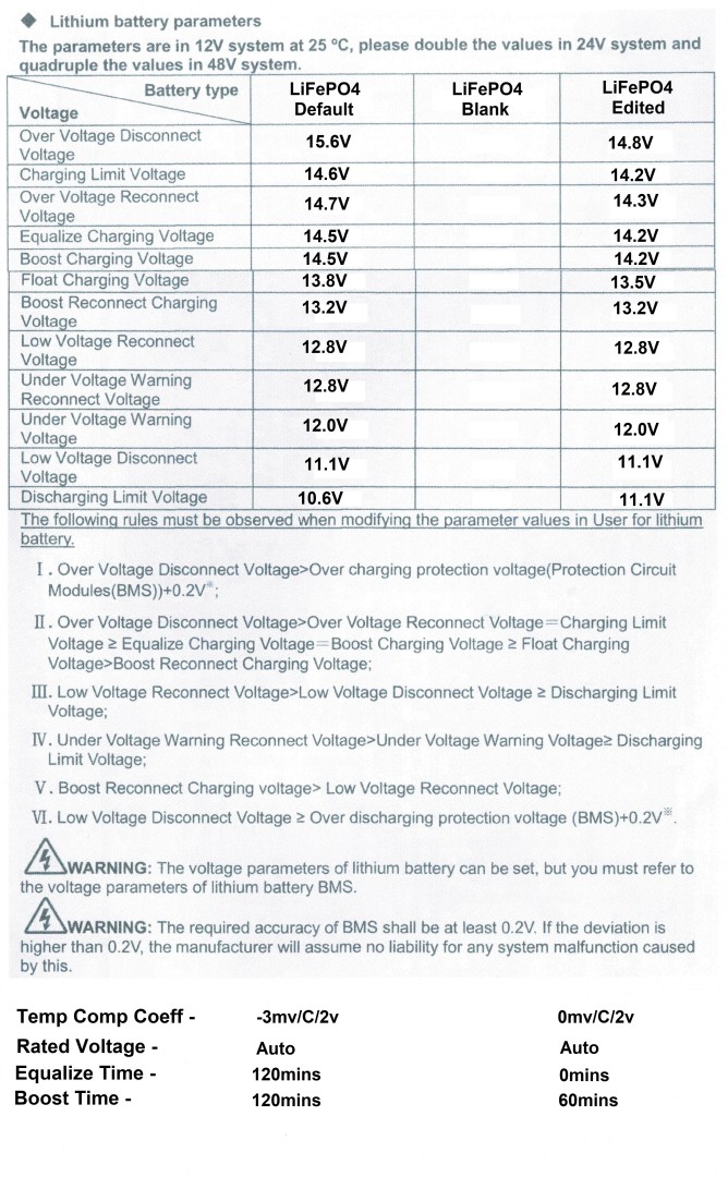 The installer thinks that my disconnecting the battery for storage six months ago has erased the supplementary settings on the LFP4S. I would have thought that the LFP4S setting was all that is required, I wasn't awarte that there was supplementary settings possible and additionally they wouldn't and shouldn't be erased by battery disconnection for storage at reduced state of charge.