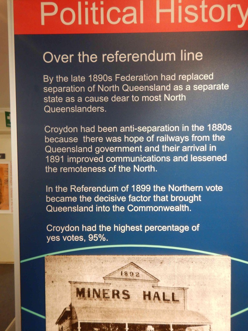 Croydon had been anti-separation in the 1880s because there was hope of railways from the Queensland government and their arrival in 1891 improved communications and lessened the remoteness of the North.