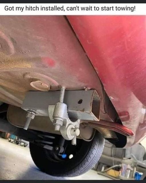 The fuel tank is usually under the back seat on more modern cars. That tow hitch would maybe just work to reverse a small sailing dingy into the water. maybe ok if he lived around the corner.