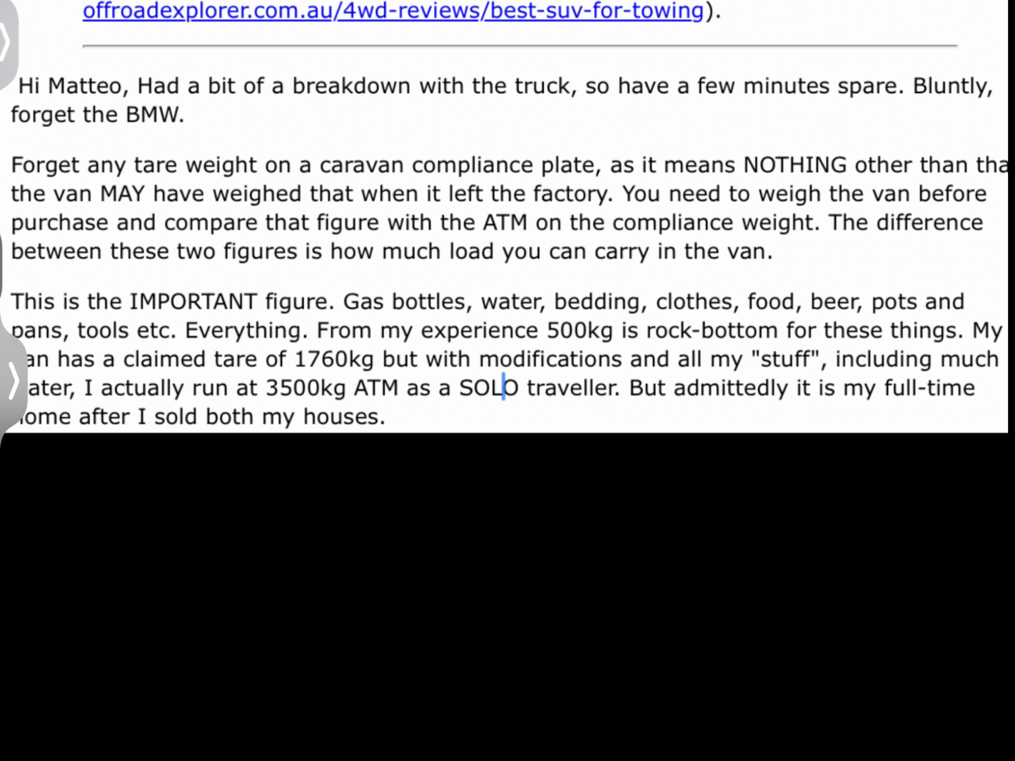 3200kg is too heavy for nearly all the common tow vehicles, let alone the specified 3500kg tow capacity. It is unachievable in practice and certainly not with safety. With many having a GCM of 6000kg, that would mean only 2800kg for the laden tow vehicle. The tow vehicle should always be heavier than what it is towing. The greater that difference the more it resists sway and other safety issues.