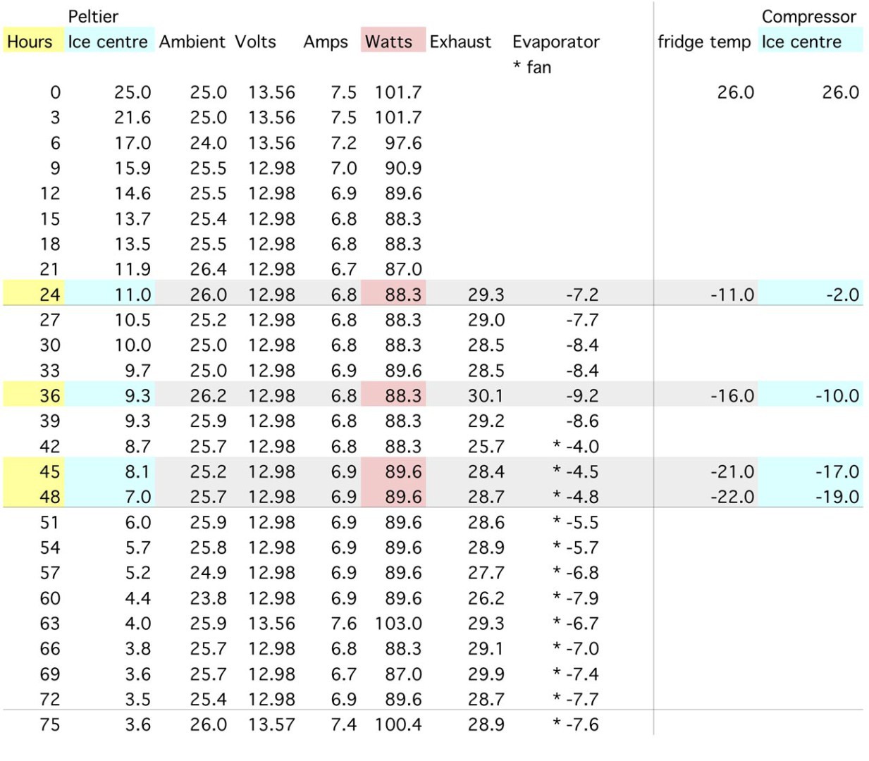 (Chart is freezing 10.5 litres of water, Peltier vs compressor refrigeration)