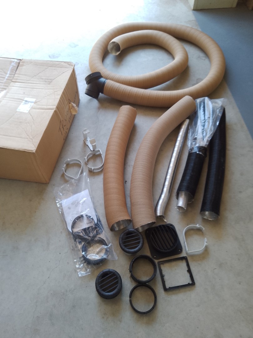 These parts are leftover from my 2 Trauma gas htr installs. Enough duct and outlets for a second outlet ( which is extra cost) if you are contemplating installing a heater or need the extra outlet, ( extra outlet kit is $215 ) the long outlet tube is about 2.9 m long. There are Inlet air vents and adapters, adjustable outlet vents, short exhaust ducts, clamps etc.