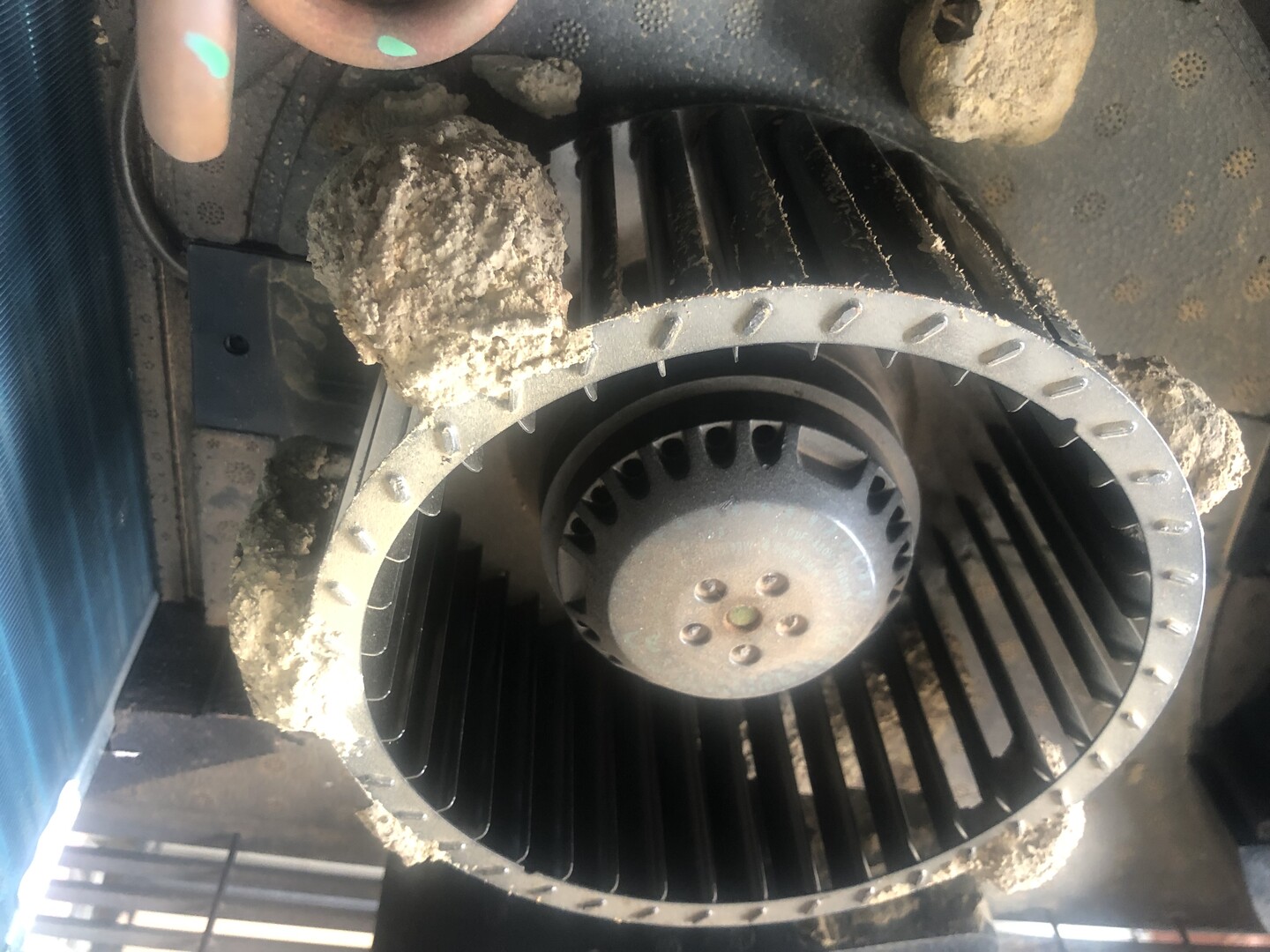 Once I had the unit on a couple of saw horses and removed the top cover I wasnt at all that surprised to find that mud wasps had built several nests on the condenser fan and prevented it from turning.
