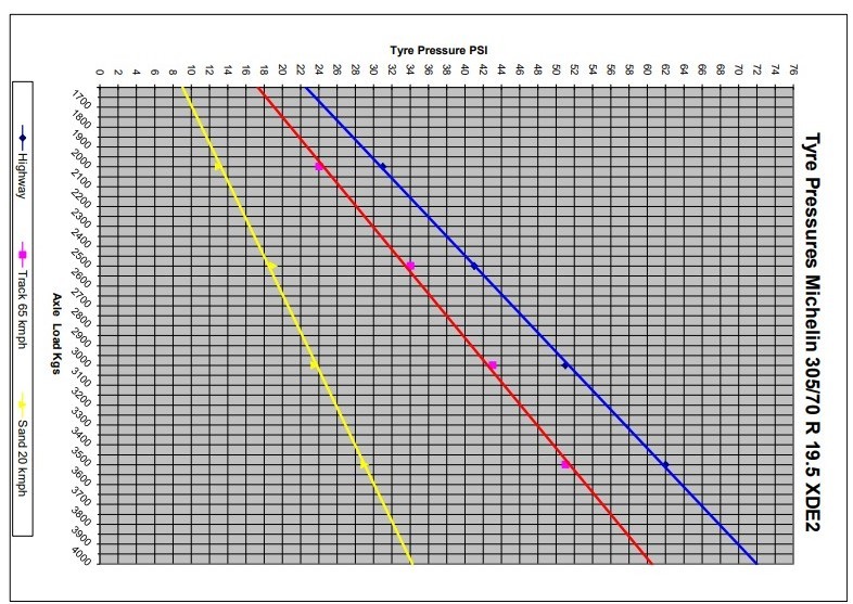 I don't know what your arguing about really, I agree with your chart as it gives the same cold pressures that I base things using the formula on a calculator, what Im saying is when the tyres get HOT the pressure shown will show if its under or over inflated for the terrain your travelling , conditions will make changes neccessary but only minor changes are usually needed , like Snowys in winter have a different pressure to Winton in summer and the 4psi bit gives a good indicator ............... Cooper Tyres explain the why www.coopertires.com.au/tyres-explained/tyre-pressure-guide/