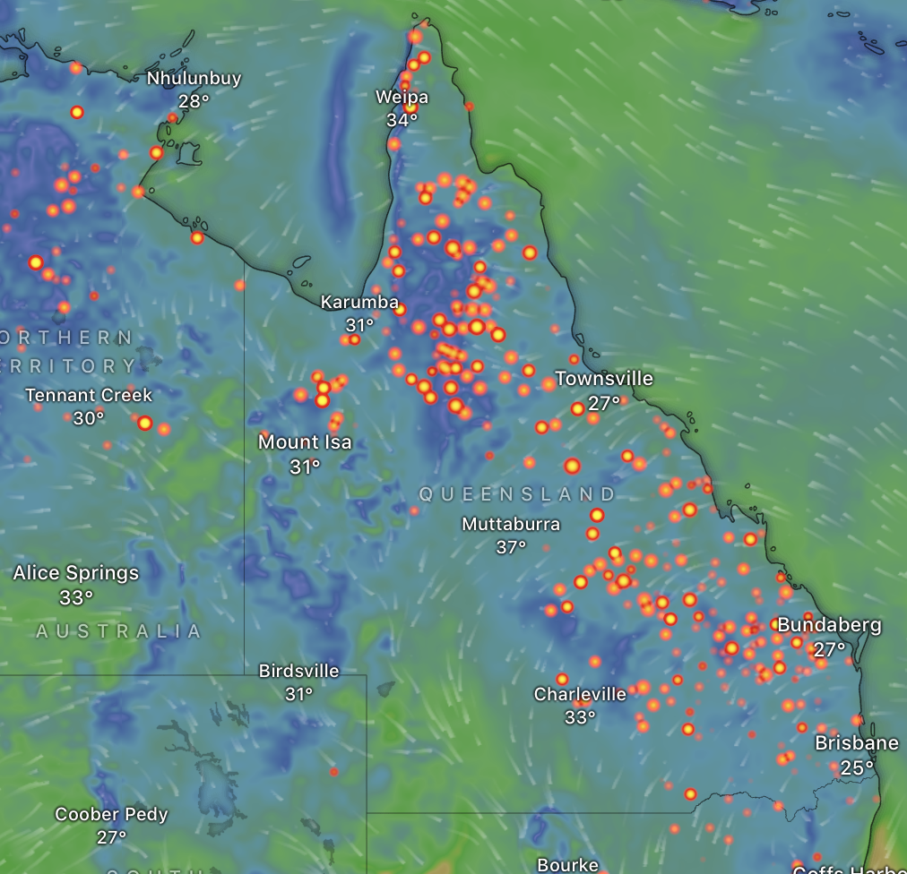 So are you now suggesting that those orange dots are sugar cane fires !!!! As I said in your other thread about the same subject, fires are a natural part of Australian life and just because there are large fires doesn't mean they are doing any harm. Fire is a very important part of any farmers' toolbox. personally, have had several fires going on my place for a few weeks now.